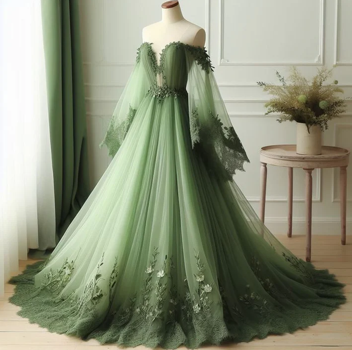 Off The Shoulder V-Neck Tulle Green Party Dress Wedding Dress With Lace Applique