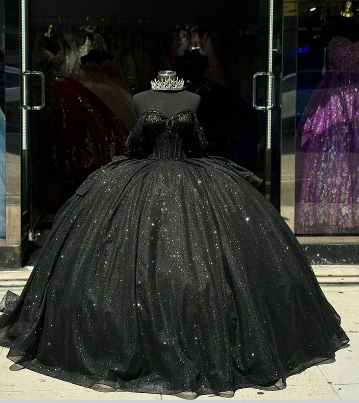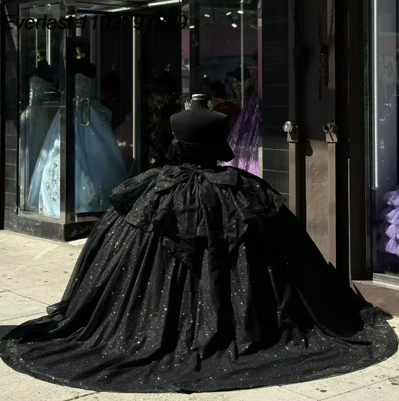 Shiny Ball Gown Black Quinceanera Dress With Bow