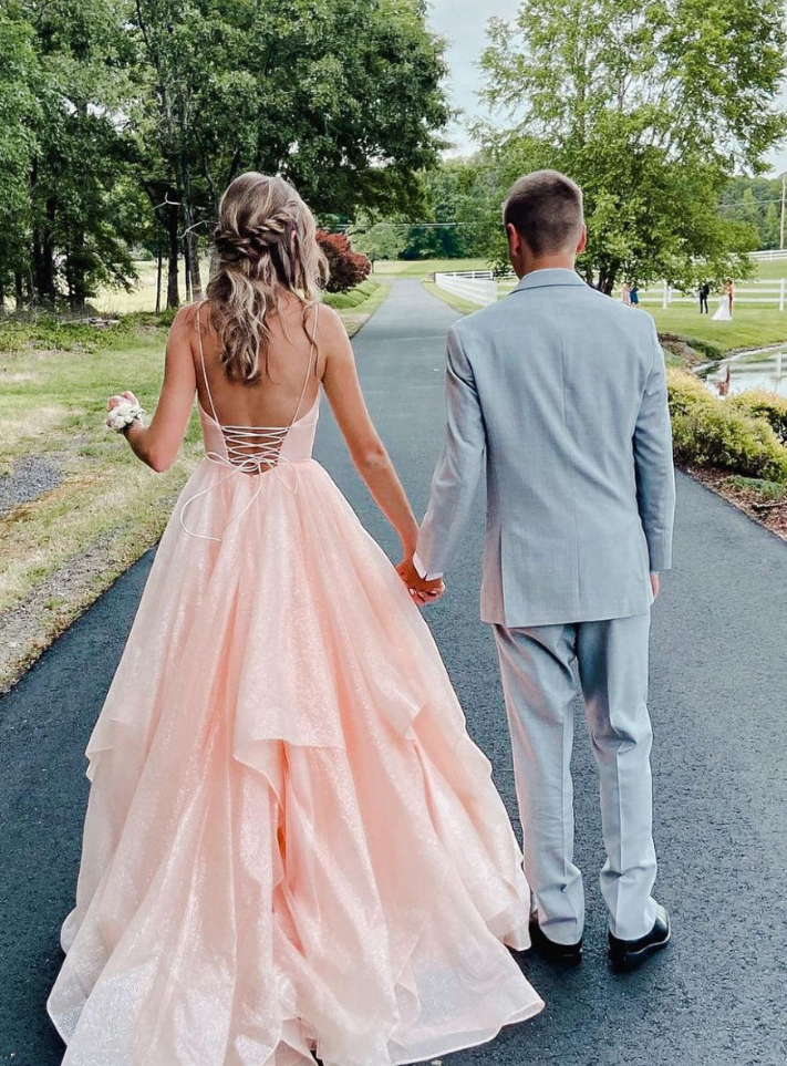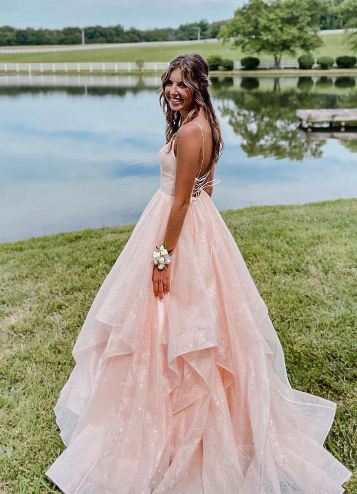 Beautiful Pink V Neck Tulle Formal Prom Dresses With Backless