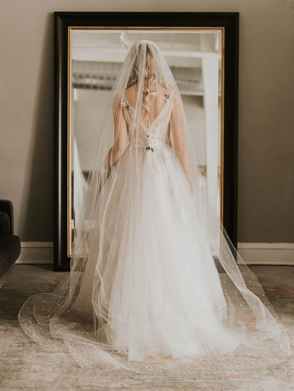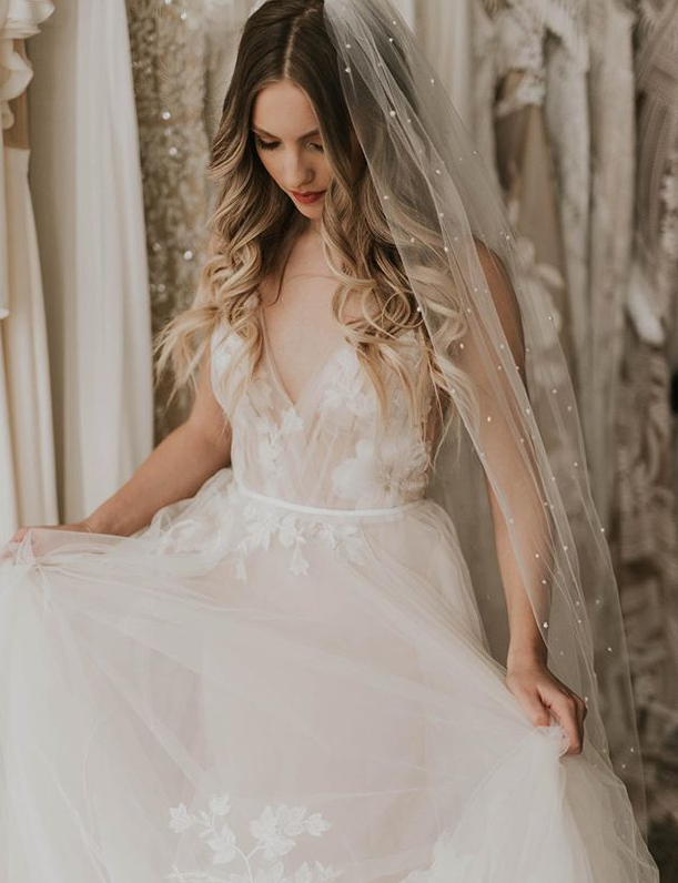 Romantic Long Tulle V Neck Ivory Wedding Dress