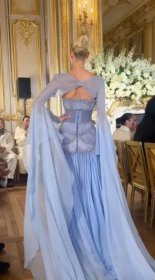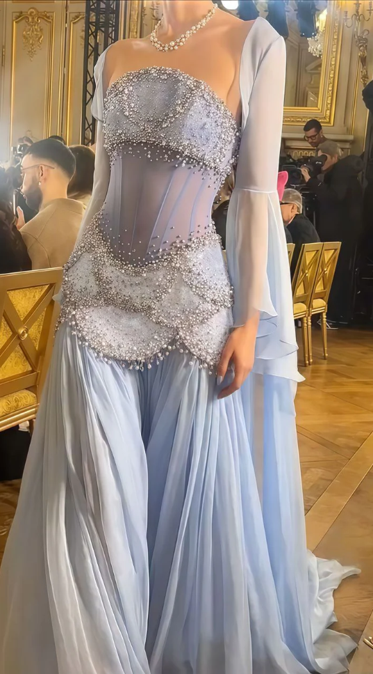 Off The Shoulder Pretty Light Blue Chiffon Prom Dresses With Beading